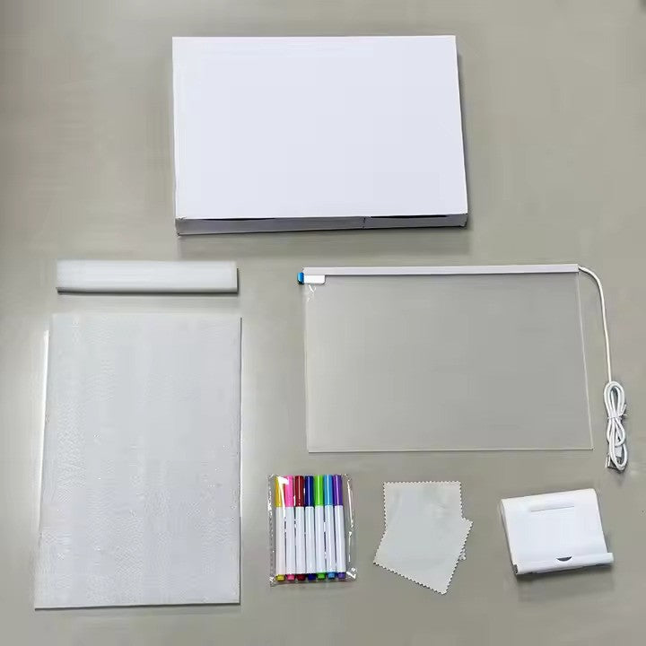 Inside the box, you'll find the acrylic board, an adjustable stand, seven vibrant color pens, two cleaning cloths, and a charging cable. Just plug it in and you’re ready to plan, draw, or dream — no extra shopping needed (charger not included ❌)!