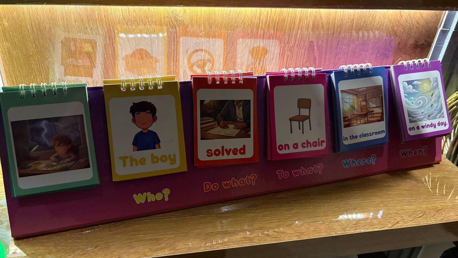 Each card shows a part of speech on one side and guiding question words like who, what, when, and where on the other, helping children understand how sentences are structured in a clear and visual way.